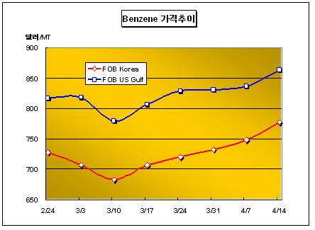 FOB Korea 775-780달러 형성 … 미국도 864달러로 27달러 올라 벤젠(Benzene) 가격은 4월14일 FOB Korea 톤당 775-780달러로 30달러 상승했다.아시아 벤젠 시장은 국제유가 강세와 다운스트림 수요 증가 및 주요 TDP(Toluene Disproportionation) 설비의 가동률 감축에 따른 수급타이트로 상승세를 이어갔다. 국제유가는 4월13일 WTI(서부텍사스중질유) 선물가격이 배럴당 69.32달러로 전일대비 0.70달러, Brent유 선물가격이 배럴당 70.57달러로 0.71달러 상승해 사상 최초로 70달러를 돌파했으며 Dubai유 현물가격은 배럴당 62.93달러로 0.58달러 하락했다. S-Oil은 톨루엔(Toluene)이 벤젠보다 고가행진을 벌이는 상황이 지속되자 톨루엔을 원료로 하는 TDP 설비 1기의 가동률을 조정한 것으로 알려졌다. SK 또한 M-X(Mixed-Xylene) 18만톤 및 7만2000톤을 생산하는 TDP 설비 2기의 가동률을 감축했으며 삼성토탈은 HDA(Hydrodealkylation) 가동률 감축을 고려하고 있는 것으로 파악되고 있다. 일반적으로 톨루엔과 C9을 원료로 벤젠과 M-X를 생산하는 TDP나 HDA 운영 시 벤젠 가격이 톨루엔보다 30달러 이상 높아야 손익분기점을 넘길 수 있으나 톨루엔 가격이 4월14일 FOB Korea 톤당 808-812달러로 20달러 상승해 벤젠보다 32.5달러 높은 가격을 형성했다. CFR SE Asia 가격은 톤당 745-755달러, CFR Taiwan 가격은 톤당 793-803달러에 마감됐다.