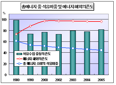 한국은 총에너지의 약 97%를 해외에서 수입하고 있고, 특히 주종 에너지인 석유는 중동에서 81% 이상 수입하고 있다.