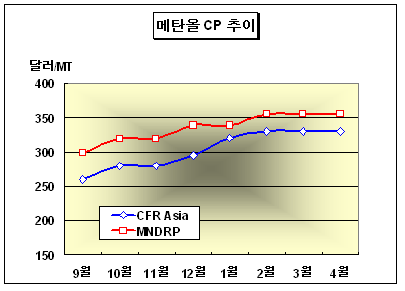 북미 MNDRP(Methanex Non Discounted Reference Price)는 2005년 12월-2006년 1월 톤당 339.25달러에서 2월 톤당 355.88달러로 상승한 이후 3-4월 보합세를 형성하고 있다. 표, 그래프: | 메탄올 CP 가격추이 | <화학저널 2006/04/17> |