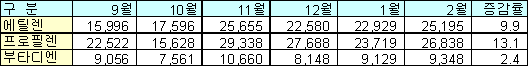 2월 에틸렌 9.9%에 부타디엔 2.4% 증가 … 프로필렌은 13.1% 늘어 올레핀(Olefin) 수출증가율이 2006년 2월 10%대를 기록했다.관세청에 따르면, 국내 에틸렌(Ethylene) 수출은 2월 2만5195톤으로 9.9%, 프로필렌(Propylene) 수출은 2만6838톤으로 13.1% 증가했다. 다만, 부타디엔(Butadiene) 수출은 9348톤으로 2.4% 증가에 그쳤다. 국내 올레핀 수출은 소폭 증가 내지 감소세를 보이고 있는데 에틸렌 수출은 2004년 30만8311톤에서 2005년 31만5574톤으로 2.4%, 프로필렌은 2004년 23만1348톤에서 2005년 25만3404톤으로 9.5% 증가했고, 부타디엔 수출은 2004년 14만5776톤에서 2005년 12만6162톤으로 13.5% 감소해 2006년 전망도 밝지 않은 것으로 전망되고 있다.