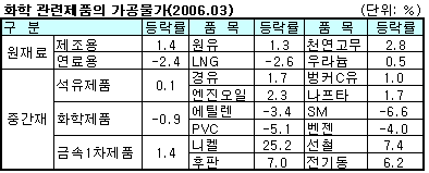 에틸렌(Ethylene)이 3.4%, SM(Styrene Monomer)이 6.6%, PVC(Polyvinyl Chloride)가 5.1%, 벤젠(Benzene)이 4.0% 하락했해 전반적으로 0.9% 내렸다. 연료ㆍ동력용은 경유, 벙커C유가 오름세를 보였으나 부탄가스, 프로판가스 등 석유가스가 계절적인 수요둔화로 수입품을 중심으로 내려 0.2% 하락했다. 표, 그래프: | 화학 관련제품의 가공물가(2006.03) | <화학저널 2006/04/20> |