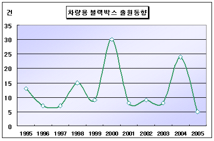 특허청, 특허출원 증가추세 … 설치 의무화로 필요성 높아져 항공기의 블랙박스와 같이 사고 당시의 상황을 추적할 수 있는 차량용 블랙박스가 개발됐다.특허청에 따르면, 자동차용 블랙박스와 관련된 특허 출원은 지금까지 총 140여건에 불과해 여타 자동차 관련 기술에 비해 기술개발이 활발히 이루어지지 않은 것으로 나타났다.