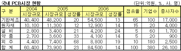 KPCA Show 2006에는 총 22개국 350개 유수기업들이 참가하며, 최우수 제품으로 선정돼 국무총리상을 받는 삼성전기의 컴퓨터 및 그래픽용 칩셋 PCB인 FCBGA(Flip-Chip BGA), 산업자원부장관상을 받는 OTS테크놀러지의 Reel Type 자동 노광기 등 국내 최초로 개발된 첨단제품과, LG전자의 PDP용 다층 FPC, 코리아써키트의 Rigid-Flex PCB, 후세메닉스의 Vaccum Press 등 세계최고 기술을 자랑하는 국내 유망기업과 이스라엘 Cemtek의 LDI(Laser Direct Imaging), 공정장비로 일본 Pentax의 Laser Photo Ploter 등 국내외의 PCB 기판, 소재, 공정장비 등 첨단제품들이 망라될 예정이다. 국내 PCB산업은 1990년대 들어 휴대폰, 반도체, 디스플레이 등 디지털전자산업의 성장세에 힘입어 매년 사상 최대 실적을 경신해왔다. 국내 PCB산업은 2005년 7조4000억원의 시장을 형성하며 세계 5위의 생산국으로 성장했고 2006년에도 세계 IT경기의 호조세에 힘입어 전년대비 14% 이상의 성장이 전망되고 있다. 표, 그래프: | 국내 PCB 시장현황 | <화학저널 2006/04/26> |