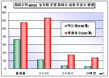 총 413개 주유소 가운데 먹는 물에서 MTBE가 검출되지 않은 주유소는 73개에 달했고, 0.2-3.0μg/L의 MTBE가 검출된 곳은 22개소, 3.0-20.0μg/L은 7개소, 20μg/L 이상 검출된 곳도 6개소에 달했다. 생활용수 가운데 MTBE가 검출되지 않은 주유소는 115개소, 0.2-3.0μg/L은 126개소, 3.0-20.0μg/L은 34개소, 20μg/L 이상이 검출된 주유소는 27개소에 달했다. 지하수가 오염된 지점을 대상으로 오염검사에 동의한 20개소의 주유소를 대상으로 토양 중 MTBE 농도를 조사한 결과 1개 지점에서 691.3ppm의 MTBE가 검출된 것을 제외하면 농도범위는 0.023-5.180ppm으로 대체로 낮은 수준이었다. 또 도시지역 주유소 지하수의 MTBE 평균 농도는 16.4μg/L이고, 농촌 지역 주유소 지하수의 MTBE 평균 농도는 4.6μg/L로 도시지역 주유소 지하수의 오염농도가 상대적으로 높았는데 상대적으로 도시에 주유소 밀도가 높고 연료 사용량도 많기 때문으로 판단된다. 표, 그래프: | 지하수의 MTBE 농도와 오염 지하수 사용 주유소 현황 | <화학저널 2006/04/27> |