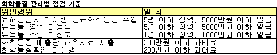 사전신고를 하지 않고 유독물을 수입한 행위에 대해서도 5-11월 7개월에 걸쳐 지속적인 점검이 이루어지며, 유해성심사를 받지 않고 신규화학물질을 수입한 행위에 대한 지도ㆍ점검도 미신고 유독물 수입행위 단속과 동시에 진행될 예정이다. 이에 따라 유해성 심사를 이행하지 않은 신규화학물질을 수입하거나 유독물 영업을 등록하지 않는 행위에 대해 5년 이하의 징역이나 5000만원 이하의 벌금이 부과되고, 유독물의 수입을 신고하지 않으면 1년 이하의 징역이나 1000만원 이하의 벌금이 부과된다. 화학물질 배출량 자료를 허위로 제출하거나 화학물질 확인을 하지 않으면 200만원 이하의 과태료가 부과된다. 표, 그래프: | 화학물질 관리법 점검 기준 | <화학저널 2006/04/27> |
