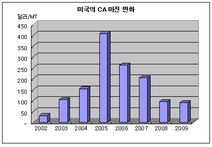 CMAI에 따르면, 2005년 ECU 마진은 톤당 평균 412달러로 2004년에 비해 150% 이상, 최저수준을 나타냈던 2002년에 비해서는 무려 13배에 달했던 것으로 추정되고 있다. Chlorine Institute는 미국 플랜트 가동률이 2004년 11월 100%에서 12월에는 101%로 상승한 것으로 파악하고 있다. 2005년 1월에는 계절적 비수기임에도 불구하고 풀가동된 것으로 알려졌다. 세계 CA 시장은 2006년 2-3월에도 수급이 타이트했으며, Dow Chemical 및 Formosa Plastics, Georgia Gulf는 정기보수에 대비해 재고를 확충하고 있다. 그러나 CMAI는 CA 마진이 2009년에는 톤당 100달러에도 미치지 못할 것으로 전망하고 있다. 표, 그래프: | 미국의 CA 마진변화 | <화학저널 2006/04/27> |