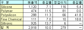 양사는 50대50 합작기업을 세워 싱가폴 200mm Wafer 설비 인근에 300mm Wafer 설비를 건설할 계획으로 투자액은 5억달러를 상회할 것으로 추정되고 있다. 이밖에도 Siltronic은 독일 Freiberg 소재 300mm Wafer 설비의 생산능력을 월 5만Wafer 증설해 월 20만Wafer로, Burghausen 소재 300mm Wafer 설비의 생산능력을 월 6만Wafer 증설해 월 13만5000Wafer로 확대할 계획이다. 한편, Wacker의 총 매출은 2005년 29억1800만유로로 10.0% 증가했고 영업이익은 2억7900만유로로 2배 급증한 것으로 나타났다. 표, 그래프: | Wacker Chemie의 경영실적(2005) | <화학저널 2006/05/01> |