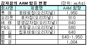 환경연합, 감자튀김 1620㎍에 감자칩 1004㎍ … 해당기업 반발 커 시중에 유통되고 있는 감자칩과 감자튀김에서 발암물질인 AAM(Acryl Amide)이 다량 함유됐다는 조사결과가 나와 파문을 일으키고 있다.서울환경운동연합에 따르면, 국내 유명 제과기업 및 패스트푸드점을 각각 5사씩 선정해 감자칩 및 감자튀김에 함유된 AAM의 성분을 분석한 결과 감자튀김에서는 kg당 평균 1620㎍, 감자칩은 1004㎍를 함유하고 있는 것으로 나타났다.