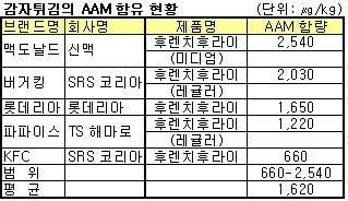 감자칩 중에서는 롯데의 포테토칩의 AAM 함량이 kg당 1950㎍로 가장 높았는데 가장 낮은 함량을 보인 농심의 칩포테토 640㎍에 비해 약 3배 높은 농도이다. 롯데 포테토칩 1봉지(무게 65g)와 맥도날드의 후렌치후라이 미디엄 1봉지(무게 114g)에 함유된 AAM의 양은 각각 세계보건기구가 정한 음용수 기준에 해당하는 물 254리터와 580리터에 함유된 양과 같아 롯데 포테토칩 3봉지, 또는 맥도날드 후렌치후라이 1봉지반만 먹어도 세계보건기구 음용수 기준을 초과한 물을 매일 2리터씩 1년 내내 마시는 것과 동일한 효과를 갖게 된다. 감자튀김 가운데서는 맥도날드 제품이 kg당 2540㎍를 함유해 AAM 함량이 가장 높았는데 KFC의 660㎍에 비해 약 4배 높은 농도이다.