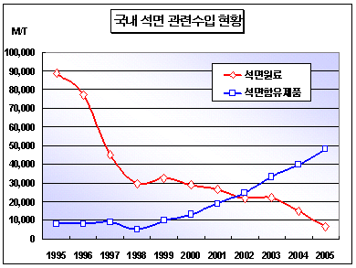 김동남 노동부 산업안전보건국장은 “석면의 유해성에 대한 인식이 높아지면서 석면원료 수입량은 감소됐으나, 석면이 함유된 브레이크라이닝, 슬레이트 등 제품 수입은 오히려 증가하는 추세”라고 지적하며, “대체화 정도 등을 고려해 2009년까지는 가능한 모든 석면함유제품의 사용을 금지할 예정”이라고 밝혔다. 이와 관련해 2004년 10월 일본에서는 석면으로 인한 직업병이 크게 문제돼 섬유강화 시멘트판, 브레이크라이닝 등 10개 석면함유 제품의 제조ㆍ수입ㆍ사용을 금지했으며, 당초 2008년까지 전면 금지하려던 계획을 앞당겨 2006년 전면 금지하는 계획을 발표한 바 있다. 석면은 내화성, 단열성, 내구성, 절연성, 유연성 등이 뛰어나 석면가스켓, 석면직물, 석면시멘트 등 다양한 분야에 이용되고 있으나 석면에 노출되면 호흡시 인체로 흡입돼 10-30년 잠복기를 거쳐 폐암, 중피종, 석면폐 등 치명적인 질병을 유발하는 것으로 나타났다. 한편, 한국은 1976-90년 연평균 약 6만3000톤의 석면을 수입했으며 1992년 약 9만5000톤을 수입해 최고치를 기록한 이후 1995년부터 지속적으로 급격한 감소세를 보이고 잇다. 석면함유제품 수입은 1998년부터 지속적으로 증가해 2005년에는 4만8000톤 가량을 수입한 것으로 추정된다. 표, 그래프: | 국내 석면 관련수입 현황 | <화학저널 2006/05/04> |