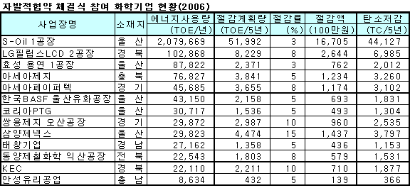 협약을 체결한 20개 사업장은 연간 373만9000TOE의 에너지를 사용하고 있는데 국내 에너지사용량의 1.7%로 전라북도의 1년간 에너지 사용량과 비슷한 수준이다. 한국은 1998년 제도가 도입된 이래 2005년까지 1288개 사업장이 참여했고 자발적협약 이행으로 1998-2004까지 약 2조5000억원의 에너지를 절감하는 성과를 거둔 것으로 평가되는데, 협약기업의 총에너지 사용량의 12.9%를 절감하는 것으로 충청북도의 연간 에너지사용량의 2배에 달하는 에너지양에 해당한다. 정세균 산자부장관은 격려사를 통해 “기업의 CEO가 중심이 돼 추진하는 자발적협약은 산업경쟁력 제고에 기여하는 동시에 기후변화협약에 따른 온실가스 저감압력에도 효과적으로 대응할 수 있기 때문에 일석이조의 효과를 거둘 수 있다”고 밝혔다. 한편, 정부는 에너지 원단위개선을 위해 총 6개 분야에서 97개 과제를 선정했는데 현재 86개 과제를 착수해 19개 과제를 완료하고 67개 과제는 정상 추진하고 있는 것으로 평가했다. 정부는 2006년 3월 현재 완료된 19개 과제를 통해 2007년까지 720만7000TOE(2조1620억원)의 에너지 절감효과를 기대하고 있고, 2005년에 착수한 55개 과제가 완료되면 2007년까지 960만6000TOE(2조8818억원)의 에너지 절감효과를 기대할 수 있을 것으로 예상하고 있다. 표, 그래프: | 자발적협약 체결식 참여 화학기업 현황(2006) | <화학저널 2006/05/08> |