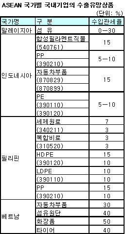 KOTRA가 발간한 <한-ASEAN FTA 체결 후 ASEAN 수출유망품목>에 따르면, 한국과 ASEAN이 시장개방 약속에 따라 관세인하가 이루어지면 에어컨 및 디지털TV 등 고급 가전은 직수출 비중이 높은 분야로 관세인하 효과가 클 것으로 보이며, SM(Styrene Monomer), PP(Polypropylene) 등 석유화학제품, 섬유원단 일부 제품 등도 관세인하에 따른 가격인하 효과가 발생할 것으로 기대된다.