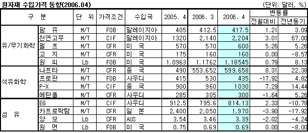 반면, 프로판은 계절적 비수기인 상황에서 높은 가격에 의한 구매감소로 가격이 하락했고, 메탄올은 주 원료인 MTBE(Methyl Tertiary Butyl Ether)의 사용중단으로 수요가 줄어 수입가격이 하락했다. 섬유원료는 중국 화섬기업들의 가동률 증가로 EG의 수요가 늘어나 가격이 상승했고 카프로락탐은 고유가임에도 불구하고 시황이 좋지 않아 수요가 줄어 가격이 하락했다. <김지은 기자> 표, 그래프: | 원자재 수입가격 동향(2006.04) | <화학저널 2006/05/11> |