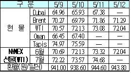 5월14일 67.38달러로 상승 … 5월15일 WTIㆍBrent 하락세 반전 Brent유 가격이 소폭 하락했다.한국석유공사에 따르면, 5월12일 거래된 Brent유 현물가격은 배럴당 0.57달러 하락한 71.29달러를 형성했고, WTI(서부텍사스 중질유) 현물가격은 배럴당 1.04달러 하락한 72.04달러에 거래됐다. NYMEX(뉴욕상업거래소) WTI 선물유가는 배럴당 1.28달러 하락한 72.04달러, IPE(영국 국제석유거래소) Brent 선물유가는 배럴당 1.11달러 하락한 72.32달러에 거래가 종료됐다. 두바이(Dubai)유 가격은 싱가폴 연휴(Vesak Day)로 평가되지 않았다.