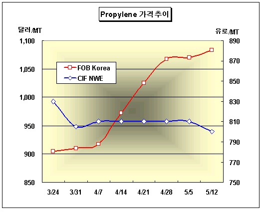 FOB Korea 1080-1085달러로 13달러 상승 … 유럽은 10유로 하락 프로필렌(Propylene) 가격은 5월12일 FOB Korea 톤당 1080-1085달러로 13달러 상승했다.아시아 프로필렌 시장은 국제유가 강세 및 중국수요 호조에 일본 Nippon Petrochemical의 프로필렌 생산설비 가동이 연기돼 1100달러를 목전에 두고 있다. 국제유가는 5월11일 WTI(서부텍사스중질유) 선물가격이 배럴당 73.32달러로 전일대비 1.19달러, Dubai유 현물가격은 배럴당 67.38달러로 1.45달러 상승했다. Nippon의 Kawasaki 소재 프로필렌 14만톤 Metathesis 플랜트는 트러블이 발생해 3월24일 가동중단됐으며 당초 수리작업에 2주 이상이 소요될 것으로 예상됐으나 5월말까지 가동이 여의치 않을 것으로 알려졌다. 국내 공급기업은 6월 초순 인도분 1500톤 Cargo를 FOB Korea 1073-1075달러에 판매했으며 동남아에는 6월 하순 인도분 브라질산 프로필렌 6000톤 Cargo가 유입될 것으로 파악되고 있다. CFR SE Asia 가격은 톤당 1095-1105달러, CFR China 가격은 톤당 1100-1105달러를 형성했다.