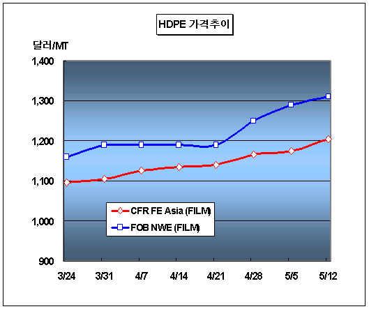 표, 그래프: | HDPE 가격추이 | <화학저널 2006/05/17> |