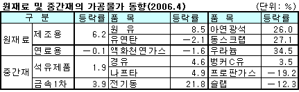 제조용이 원유, 동광석, 아연광석 등 수입품목을 중심으로 전월대비 6.2% 상승했으나 연료용은 계절적인 비수기로 인해 유연탄, 액화천연가스 등이 하락세를 지속해 0.1% 하락했다. 중간재는 전자부품, 영상, 음향 및 통신장치가 환율하락, 경쟁심화로 하락했으나 석유제품, 금속1차제품이 고유가 지속과 국제원자재가격 상승으로 올라 전월대비 0.8%, 전년동월대비 1.2% 상승했다. 제조용에서는 집적회로, TFT-LCD 등이 내림세를 보였으나 전기동, 금괴, 동, 니켈 등 금속제품이 올라 0.7% 상승했다. 연료ㆍ동력용은 부탄가스, 프로판가스 등이 내림세를 보였으나 경유, 벙커C유 등이 올라 1.7% 상승했다. 최종재는 석유제품이 국제유가 상승으로 오름세를 지속하고 전기기계 및 장치가 전력케이블, 통신케이블을 중심으로 올라 전월대비 0.6% 상승, 전년동월대비 0.3% 하락했다. 표, 그래프: | 원재료 및 중간재의 가공물가 동향 | <화학저널 2006/05/22> |