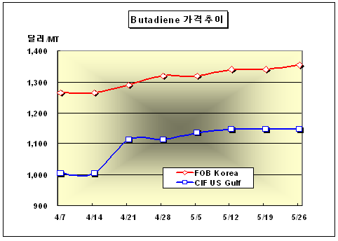 FOB Korea 1350-1360달러로 15달러 상승 … 미국은 3주째 보합세 부타디엔(Butadiene) 가격은 5월26일 FOB Korea 톤당 1350-1360달러로 15달러 상승했다.아시아 부타디엔 시장은 국제유가 강세 및 일본 소재 플랜트 3기의 정기보수에 따라 톤당 1350달러대를 돌파했다. 국제유가는 5월26일 WTI(서부텍사스중질유) 선물가격이 배럴당 71.37달러로 전일대비 0.05달러, Dubai유 현물가격이 배럴당 65.16달러로 1.34달러 상승했다. Spot 시장은 일본 Chiba Butadiene, JSR, Nippon Zeon의 부타디엔 플랜트 정기보수에 따라 수급이 다소 타이트한 것으로 알려졌다. 그러나 한국과 중국의 주요 다운스트림 플랜트들이 5월 정기보수에 돌입하고 LG석유화학의 부타디엔 생산능력이 14만5000톤으로 1만톤 확대돼 가격상승폭을 제한하고 있는 것으로 판단된다. 금호석유화학의 BR(Butadiene Rubber) 플랜트는 5월15일부터 20일간의 정기보수에 돌입하고 중국 Baling Petrochemical의 BR 플랜트, Lanzhou Petrochemical의 SBR(Styrene Butadiene Rubber) 플랜트, Beijing Yanshan Petrochemical의 TPE(Thermoplastic Elastomer) 플랜트도 5월 정기보수를 실시할 것으로 알려졌다. 여천NCC는 6월 하순 인도분 Cargo에 대해 FOB Korea 톤당 1400달러를 제시했으며 CFR Taiwan 가격은 톤당 1360-1370달러, CFR SE Asia 가격은 톤당 1340-1350달러에 마감됐다.