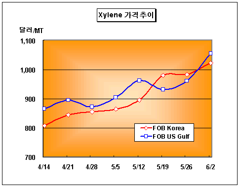 자일렌(Xylene) 가격은 6월2일 Isomer 그레이드 기준 FOB Korea 톤당 1022-1023달러로 40달러 상승했다.