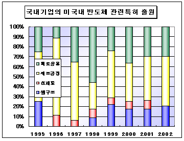 차세대 반도체 특허의 중심축이 제조공정 분야에서 회로ㆍ응용 분야로 이동되는 이유는 최근 가장 높은 출원 증가율을 보이고 있는 M램의 특허가 주로 회로ㆍ응용 분야에 치우치기 때문이다. 같은 차세대 반도체라 하더라도 F램이나 P램은 기존 D램처럼 전하량에 기준을 두는 데 비해 M램은 읽기ㆍ쓰기의 기본 동작이 전류방향에 기준을 두고 있어 기존의 D램에서 사용하던 회로기술과는 전혀 다른 개념의 회로개발을 필요로 한다는 점과 제조공정 분야의 특허에 비해 회로ㆍ응용 분야의 특허가 타 기업의 특허권 침해여부를 밝혀내기가 수월하다는 점이 장점으로 부각되면서 리딩기업들이 제조공정 분야보다 특허권 행사가 용이한 회로ㆍ응용 분야의 특허에 더 주력하기 때문으로 파악된다. 한편, 차세대 반도체에 대한 기술 분야별 특허현황은 일본과 미국에서 회로ㆍ응용 분야에 관한 특허의 비율이 거의 50%에 육박할 정도로 증가했으나 국내기업은 아직은 제조공정 분야에 치중하고 있는 것으로 분석됐다. 표, 그래프: | 국내 기업의 미국내 반도체 관련특허 출원 | <화학저널 2006/06/09> |