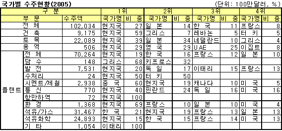 석유화학ㆍ가스 부문 15-20% 기록 … 2005년 시장규모1183억달러 2005년 한국의 중동 플랜트 시장점유율이 세계 1위를 차지한 것으로 집계됐다.대외경제정책연구원(KIEP)이 6월5일 발표한 <오늘의 세계경제>에 따르면, 걸프협력협의체(GCC: Gulf Cooperation Council) 국가인 사우디, UAE, 쿠웨이트, 오만, 카타르, 바레인 등 6개국과 이란, 이라크를 포함한 8개국을 대상으로 조사한 결과 최근 3년간 한국은 중동 전체 건설ㆍ플랜트 발주의 9.3%를 수주해 일본, 미국에 이어 3위를 기록했는데 2005년 플랜트 부문에서는 시장점유율 16%로 1위를 차지했다.