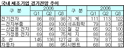 산은, BSI 83에서 85로 약상승 … 내수부진에 수익성 악화가 주 요인 2006년 하반기 경기하강에 대한 우려가 심화되고 있는 가운데 제조기업들의 경기전망도 악화된 것으로 조사됐다.산업은행이 제조기업 1218사를 대상으로 한 3/4분기 산업경기전망을 조사한 결과, 사업개황지수(BSI)가 99로 조사됐다.