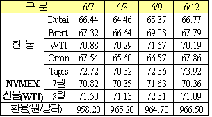 6월12일 66.77달러로 1.40달러 상승 … Brent유ㆍWTI는 하락 두바이(Dubai)유 가격이 급등했다.한국석유공사에 따르면, 6월12일 거래된 중동산 두바이유 현물가격은 배럴당 66.77달러로 전날보다 1.40달러 상승했다. Brent유 현물가격은 배럴당 1.29달러 하락한 67.79달러를 형성했고, WTI(서부텍사스 중질유) 현물가격은 배럴당 1.48달러 하락한 70.19달러에 거래됐다. NYMEX(뉴욕상업거래소) WTI 선물유가는 배럴당 1.27달러 하락한 70.36달러, IPE(영국 국제석유거래소) Brent 선물유가는 배럴당 1.55달러 하락한 68.93달러에 거래가 종료됐다.