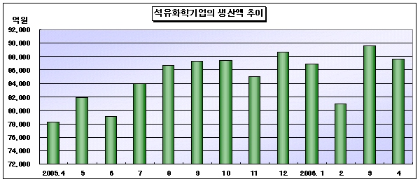 이는 고유가로 인한 전반적인 소비심리 위축과 자동차업종의 생산ㆍ수출 감소와 대형 원유정제기업의 정기보수에 기인해 산업단지 생산이 소폭 감소한 것으로 조사됐다. 2006년 4월 국가산업단지 석유화학산업의 생산은 3월에 비해 대비 2.2% 감소했으나 2005년 4월과 비교했을 때 11.9% 증가한 8조7596억원을 기록했다. 최근 국제유가 상승 추세가 지속됨에 따라 휘발유 등 국내 석유제품의 가격 상승 및 국제 석유화학제품의 수출이 증가했음에도 불구하고, 대형 원유정제기업의 정기보수로 인해 생산이 소폭 감소한 것으로 분석됐다. 석유화학산업 수출은 국제 석유화학제품의 가격 상승 및 국내 정유기업의 생산능력 확대에 힘입어 크게 증가했다. 석유화학수출은 3월에 비해 7.1%, 2005년 4월에 비해 29.4% 증가한 35억6000만달러를 기록했다. 전체 수출은 116억6900만달러를 기록해 3월보다 2.9%, 2005년 4월에 비해서는 17.9% 증가한 것으로 나타났다. 원/달러 환율하락, 고유가, 원자재 가격상승 등의 부정적인 요인에도 불구하고, 석유화학산업의 수출 호조세 지속과 선박 인디아 스케줄상의 물량 인도 급증에 기인해 조선산업의 수출이 크게 증가한 결과이다. 입주기업수와 고용은 2만4783사, 66만525명을 기록해 2005년 4월에 비해 13.6%, 5.7% 증가한 것으로 나타났는데 수도권지역을 중심으로 한 아파트형공장 및 신규입주 증가에 기인한 결과로 분석됐다. 표, 그래프: | 석유화학기업의 생산액 추이 | <화학저널 2006/06/14> |