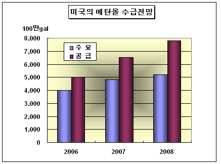 베네주엘라 정부는 2010년까지 바이오에탄올 플랜트 15기를 건설해 일일 5만5000배럴(연간 2000만배럴)의 생산능력을 갖출 방침으로 원료인 사탕수수 농장(30만헥타르) 조성에는 9억5000만달러를 투자할 것으로 알려졌다. 베네주엘라는 무연휘발유 권장정책에 따라 현재 MTBE를 첨가제로 사용하고 있으나 장기적으로 바이오에탄올으로의 전환을 꾀하고 있으며 베네주엘라의 MTBE 생산량은 일일 8000배럴, 수입량은 일일 1만2000배럴로 파악되고 있다. 표, 그래프: | 미국의 에탄올 수급전망 | <화학저널 2006/06/19> |
