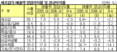 한은, 1/4분기 매출액 영업이익률 3.2%p 하락 … 경상이익률은 -2.5%p 석유화학기업들의 2006년 1/4분기 매출액 증가율이 둔화된 것으로 나타났다.한국은행이 발표한 <2006년 1/4분기 기업경영분석 결과>에 따르면, 2006년 1/4분기 조사대상 상장ㆍ등록법인의 전년동기대비 매출액 증가율은 6.9%로 2005년 1/4분기 4.3%에 비해 2.6%p 상승했다. * 매도가능증권을 지분법적용 투자주식으로 변경함에 따른 수익 제외시 제조업 및 금속제품의 매출액 경상이익률은 각각 9.1% 및 19.3% 비제조업의 매출액 증가율은 8.2%로 제조업 6.1%보다 높은 수준을 보인 가운데 상승폭도 더 큰 것으로 나타났다.