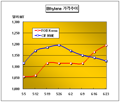 FOB Korea 1190-1200달러로 30달러 상승 … 중국 수급타이트로 에틸렌(Ethylene) 가격은 6월23일 FOB Korea 톤당 1190-1200달러로 30달러 상승했다.아시아 에틸렌 시장은 국제유가 강세 및 중국 Shanghai Secco의 Spot Cargo 출하 제한에 따른 수급타이트로 상승세를 이어갔다. 국제유가는 6월23일 WTI(서부텍사스중질유) 선물가격이 배럴당 70.87달러로 전일대비 0.03달러 상승했고 Dubai유 현물가격은 배럴당 64.87달러로 0.14달러 하락했다. Shanghai Secco의 90만톤 크래커는 Shanghai Chlor Alkali의 신규 EDC(Ethylene Dichloride) 36만톤 플랜트 가동에 따라 에틸렌 조달을 위해 Spot Cargo 출하를 줄인 것으로 알려졌다. 신규 EDC 플랜트는 6월19일 가동에 들어갔으며 4주 후 상업가동을 전개할 것으로 파악되고 있다. CFR FE Asia 가격은 톤당 1200-1210달러, CFR SE Asia 가격은 톤당 1250-1260달러에 마감됐다.