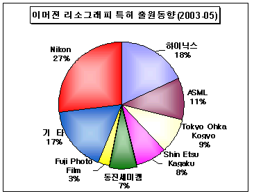 물은 공기보다 큰 굴절률로 인해 해상도를 크게 높일 수 있고, 또렷한 영상을 얻을 수 있는 렌즈에서 상까지의 거리를 늘려주는 장점이 있지만, 웨이퍼가 리소그래피 기계 아래에서 빠른 속도로 움직이는 동안 만들어지는 작은 물방울들이 반도체 회로의 이미지에 치명적인 흠이 가게 할 수도 있다. 따라서 이머젼 리소그래피 기술 가운데서도 불량의 원인인 물속의 미세한 기포를 억제하는 기술, 물속에 잠겨서도 안정한 해상도가 가능한 재료, 프로세서 등의 개발에 귀추가 주목되고 있다. 1980년부터 이머젼에 관한 연구가 간혹 있어 왔으나, 현재의 불소화 아르곤 레이저(ArF) 광원을 포함하는 이머젼 리소그래피 관련기술은 EU, 일본, 독일 등에 의해 2002년부터 본격적으로 개발되기 시작했으며, 국내에는 2003년 이후 출원되기 시작했다. 특허청에 따르면, 이머젼 리소그래피 관련기술은 2003-05년 총 163건이 출원됐으며, 단순 리소그래피장치 유사관련 기술을 제외한 핵심 이머젼 리소그래피 관련기술 특허출원은 100건으로, 2003년 11건, 2004년 47건, 2005년 42건이 출원됐다. 출원인별로는 해외기업의 출원이 전체의 72%, 국내기업의 출원이 28%를 차지했다. 해외기업으로 Nikon, ASML Netherlands B.V, Canon 등은 노광장치 및 디바이스제조 관련기술에, Tokyo Ohka Kogyo, Shin Etsu Kagaku 등은 레지스트재료 관련기술에 집중하고 있는 것으로 나타났다. 국내기업으로 동진세미켐은 이머젼 리소그래피 전용 레지스트 재료에, 하이닉스반도체는 레지스트 재료 뿐만 아니라 노광장치 관련기술에서 선두적인 역할을 하고 있는 것으로 조사됐다. 특허청 관계자는 “이머젼 리소그래피를 이용한 기술은 2003년을 전후로 국내외 반도체 산업계에서 기존 사진 현상 방식의 미세화 한계점을 극복하기 위한 차세대 기술로서 요구와 관심이 급속히 높아지고 있다”며 “2009년경에는 상업용으로 생산될 것으로 예상된다”고 밝혔다. 표, 그래프: | 이머젼 리소그래피 특허 출원동향(2003-05) | <화학저널 2006/06/28> |