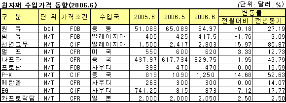 원유는 이란 핵문제 우려감 완화, 미국 석유재고 증가, 금리인상 움직임 등에 따른 수요둔화 가능성이 제기되면서 가격이 하락해 배럴당 64.97달러를 기록했다. 나프타(Naphtha)는 원유 하락에도 불구하고 수요가 증가해 가격이 톤당 629.75달러로 상승했으며, 프로판(Propane)은 5월에 이어 강세기조를 보이며 톤당 470달러를 기록했다. 2005년 5월에 비해 가장 큰 폭의 상승률을 기록한 종목은 최근 투자수단으로서 큰 인기를 누리고 있는 비철금속으로 무려 61.02% 올랐으며, 고유가의 영향으로 높은 가격대를 유지하고 있는 석유화학원료가 36.74% 상승해 뒤를 이었다. 전월대비 상승률은 주 원료 부족으로 생산량이 감소한 천연고무(15.97%)가 가장 높았으며, 원료인 M-X (Mixed Xylene) 부족으로 수요가 급증한 P-X(Para-Xylene)가 14.68% 상승한 톤당 1250달러, 원료공급 차질로 생산이 원활하지 않은 EG(Ethylene Glycol)가 7.12% 상승한 톤당 873달러에 달해 뒤를 이었다. 반면, 하락률은 전기동을 비롯한 메이저 품목들의 가격 하락에 영향을 받은 연(납)이 17.09% 하락해 가장 큰 하락세를 보였으며, 최근 초강세를 이어가던 알루미늄이 13.77%, 금이 12.11%, 전기동이 9.63% 떨어지는 등 일제히 하락세를 기록했다. 이외에 옥수수, 원당, 프로판, 메탄올(Methanol), 양모는 시장의 안정 속에 보합세를 기록했다. 카프로락탐(Caprolactam)은 주 원료인 벤젠(Benzene) 가격 인상으로 톤당 2050달러로 상승했다. 전년동기대비 상승률은 최근 7개월째 상승세를 기록하고 있는 천연고무가 무려 86.87% 상승해 전기동의 뒤를 이었으며, P-X도 52.63% 상승했다. 표, 그래프: | 원자재 수입가격 동향(2006.6) | <화학저널 2006/07/06> |