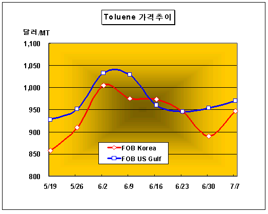 FOB Korea 945-950달러 형성 … 고유가에 중국 매수세 전환 톨루엔(Toluene) 가격은 7월7일 FOB Korea 톤당 945-950달러로 58달러 급등했다.아시아 톨루엔 시장은 국제유가 강세 지속에 따른 중국 수요기업들의 매수세 전환에 힘입어 톤당 900달러대 탈환에 성공했다. 국제유가는 7월7일 WTI(서부텍사스중질유) 선물가격이 배럴당 74.09달러로 전일대비 1.05달러 하락했고 두바이유 현물가격은 배럴당 69.50달러로 0.11달러 상승했다. 중국 수요기업들은 고유가 상황이 완화될 기미를 보이지 않자 서둘러 구매에 나섰으며 Raystar는 Noble에 8월 인도분 Cargo를 FOB Korea 톤당 945달러에 판매한 것으로 알려졌다. 6월3일 정기보수를 시작한 SK인천정유의 벤젠(Benzene) 10만톤, 톨루엔 25만톤, M-X(Mixed-Xylene) 40만톤 설비는 7월8일 정기보수를 마무리한 것으로 파악되고 있다. CFR China 가격은 톤당 960-970달러, CFR SE Asia는 톤당 955-965달러를 형성했으며 중국 내수가격은 ex-Tank 톤당 8825-8875위안에 마감됐다.