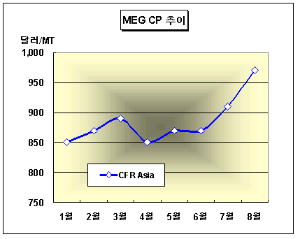 메이저 3사 일제히 60달러 인상 … 톤당 1000달러 돌파에 관심집중 MEG(Monoethylene Glycol) 8월 계약가격(CP)은 CFR Asia 톤당 970달러로 60달러 급등했다.아시아 계약가격은 2006년 5-6월 870달러에서 7월 910달러로 900달러대를 돌파했으며 8월 MEGlobal, Shell, Sabic 모두 일제히 가격을 인상해 2005년 11월 가격인 톤당 980달러에 근접한 것으로 파악되고 있다. MEG 계약가격은 2005년 1-5월 1000달러대를 호가했지만 6월부터 하락해 800-900달러대에서 등락을 거듭했으며 메이저 3사의 인상 기조에 따라 2006년 하반기 1000달러시대 재도래도 배제할 수 없는 상황으로 판단된다. Spot 시세도 호조를 보이고 있는데 7월7일 CFR Korea 톤당 915-920달러를 기록해 전주대비 8달러 상승한 것으로 나타났다.