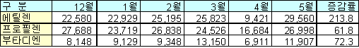 관세청에 따르면, 에틸렌(Ethylene) 수출은 2만9560톤으로 213.8% 폭증했으며 프로필렌(Propylene)과 부타디엔(Butadiene)은 각각 2만6998톤, 1만1907톤으로 2자릿수 증가율을 기록한 것으로 나타났다.