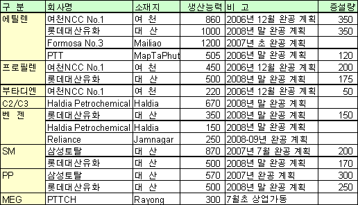 No.1 크래커 86만톤으로 확장 … 롯데대산유화도 증설작업 박차 여천NCC가 국내 에틸렌(Ethylene) 생산능력 1위로 부상할 전망이다.여천NCC는 11월 50일간의 정기보수 기간을 통해 No.1 51만톤 크래커의 생산능력을 86만톤으로 증설하는 동시에 프로필렌(Propylene) 생산능력도 25만톤에서 45만톤으로 확대할 계획이다. 이에 따라 여천NCC의 에틸렌 생산능력은 No.2 52만톤, No.3 43만5000톤 크래커를 더해 181만5000톤으로, 프로필렌 생산능력은 No.2 27만5000톤, No.3 23만6000톤을 더해 96만1000톤으로 확장될 예정이다. 계획대로 증설이 진행되면 2008년 에틸렌 172만톤 시대를 맞는 롯데그룹에 앞서 국내 최대의 에틸렌 생산능력을 보유하는 것으로 롯데는 롯대대산유화의 에틸렌 생산능력을 65만톤에서 100만톤으로, 프로필렌 생산능력은 32만5000톤에서 50만톤으로 증설할 방침이다.