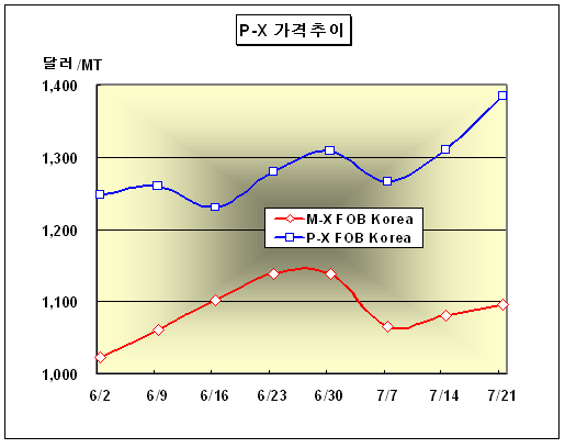 FOB Korea 1383-1387달러로 75달러 급등 … CPC는 불가항력 선언 P-X(Para-Xylene) 가격은 7월21일 FOB Korea 톤당 1383-1387달러로 75달러 급등했다.아시아 P-X 시장은 업스트림인 M-X(Mixed-Xylene) 상승세 속에서 글로벌 수급타이트가 심화돼 1400달러대 진입을 노리고 있다. M-X 가격은 FOB Korea 톤당 1093-1097달러로 15달러 상승했으며 타이완 CPC는 7월19일 Lin Yuan 소재 No.3 P-X 26만톤 플랜트의 불가항력을 선언한 것으로 알려졌다. No.3 플랜트는 7월14일 4주간의 정기보수를 마치고 재가동에 들어갔으나 Exchanger에 문제가 발생해 불가항력이 선언됐으며 재가동까지 4주 가량 소요될 것으로 파악되고 있다. 게다가 2005년 3월23일 발생한 폭발사고로 큰 피해를 입은 BP의 미국 텍사스 Texas City 소재 정유공장 내 P-X 109만9000톤 플랜트가 7월 현재까지도 100% 가동률을 회복하지 못해 수급타이트에 일조하고 있는 실정이다.