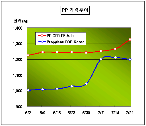 CFR FE Asia 1320-1330달러 형성 … 신규 30만톤 플랜트 완공 임박 PP 가격은 Raffia/Injection 그레이드 기준 7월19일 CFR FE Asia 톤당 1320-1330달러로 57달러 급등했다.아시아 PP(Polypropylene) 시장은 업스트림인 프로필렌(Propylene) 가격강세와 중국수요 호조로 1300달러대 진입에 성공했다. 프로필렌 가격은 7월21일 FOB Korea 톤당 1195-1205달러로 13달러 하락했으나 여전히 1200달러대를 고수하고 있으며 한국과 타이완의 재고가 많지 않다는 소식이 전해지면서 중국의 시장참여가 활발했던 것으로 나타났다. Block Copolymer 그레이드는 CFR FE Asia 톤당 1350-1360달러로 55달러 급등했으며 중국 내수가격은 Raffia/Injection 기준 ex-Works 톤당 1만2500-1만2600위안을 형성했다. 중국 Sinopec Maoming Petrochemical의 신규 HDPE(High-Density PE) 35만톤 플랜트와 PP 30만톤 플랜트는 7월말 완공될 것으로 알려졌다.