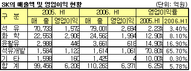 상반기 매출 11조원에 영업이익 6371억원 … 영업이익률은 하락 SK는 7월25일 2006년 상반기 매출 11조263억원, 영업이익 6371억원의 경영실적을 달성했다고 발표했다.매출은 2005년 상반기에 비해 10.87%, 영업이익은 2.63% 늘어났으나 영업이익률은 2005년 상반기 6.25%에서 0.47%p 낮아진 5.78%로 나타났다. 상반기 가장 높은 영업이익률을 기록한 부문은 석유개발사업으로 2005년 상반기와 비슷한 수준인 매출 1614억원, 영업이익 1061억원을 달성해 65.7%라는 높은 영업이익률을 기록했다.