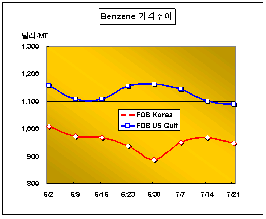 FOB Korea 945-950달러 형성 … 미국 수급타이트에 반등 가능성 벤젠(Benzene) 가격은 7월21일 FOB Korea 톤당 945-950달러로 20달러 하락했다.아시아 벤젠 시장은 국제유가 강세에도 불구하고 중국 수요기업들의 매수세가 다소 부진해 하락세를 면치 못했다. 국제유가는 7월21일 WTI(서부텍사스중질유) 선물가격이 배럴당 73.43달러로 전일대비 0.16달러 상승했고 두바이유 현물가격은 배럴당 68.51달러로 0.11달러 하락했다. 그러나 미국시장 수급타이트가 전개되고 있어 변수가 될 것으로 예상되는데 BP의 텍사스 Texas City 소재 정유공장(일일 43만5000배럴)의 BTX 일산 5만5000배럴 Reformer는 7월 3째주 긴급 유지보수에 돌입한 것으로 알려졌다. 게다가 Marathon Oil의 켄터키 Catlettsburg 소재 정유공장(일일 22만2000배럴)의 Reformer도 2주 계획으로 진행중인 정기보수를 연장할 예정이고 ConocoPhillips의 일리노이 Wood River 소재 정유공장(일일 30만6000배럴)은 폭풍우에 전력공급이 중단돼 7월말까지 가동재개가 어려울 것으로 파악되고 있다. CFR SE Asia 가격은 톤당 939-941달러, CFR Taiwan 가격은 톤당 970-975달러에 마감됐다.