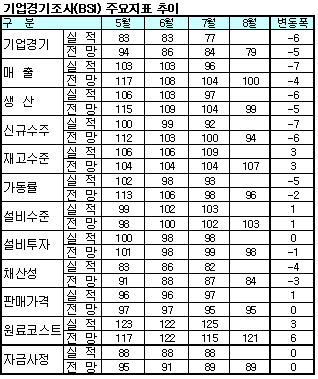 한은, 7월 BSI 77로 6p 하락 … 환율하락ㆍ원료코스트 상승이 요인 기업체감경기가 급랭하면서 제조업 경기실사지수가 연중 최저치로 추락했다.