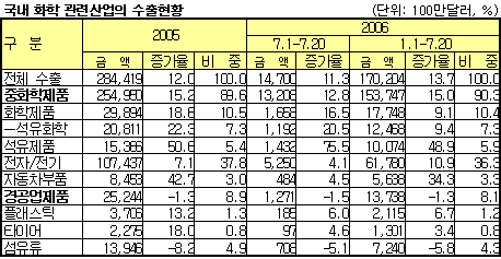 7월 26.2% 증가 21억3000만달러 … 총 수출은 261억3000만달러 7월 석유화학제품의 수출이 호조를 보인 것으로 나타났다.산업자원부가 발표한 <2006년 7월 수출입동향>에 따르면, 7월 수출은 전년동월대비 12.4% 증가한 261억3000만달러를 기록했다. 수출은 고유가 및 수요 호조 등에 따라 수출가격이 상승하면서 석유제품 수출이 64.1%, 석유화학이 26.2%, LCD 패널이 46.5% 증가하는 등 호조를 지속했다. 반면, 자동차 수출은 30.6%, 자동차부품은 8.1% 감소했는데 노사문제에 따른 생산차질이 주요 원인이었던 것으로 분석된다.