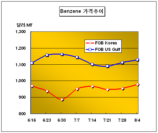 벤젠(Benzene) 가격은 8월4일 FOB Korea 톤당 979-981달러로 25달러 상승했다.