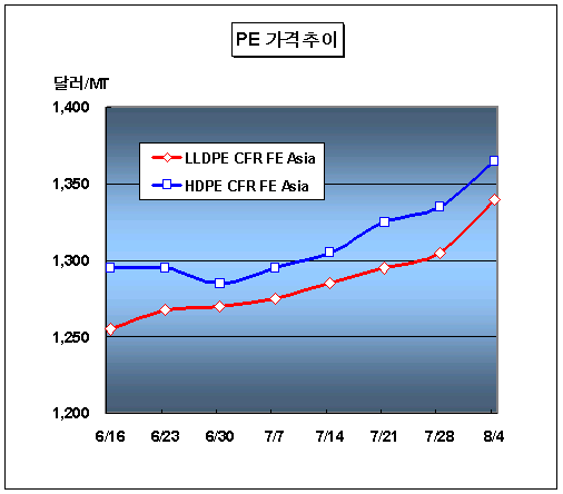 톤당 30-35달러 상승 최고가 갱신 … SK의 9월 정기보수가 고비 HDPE 가격은 8월2일 Film 그레이드 기준 CFR FE Asia 톤당 1360-1370달러로 30달러 상승했다.아시아 HDPE(High-Density Polyethylene) 시장은 에틸렌(Ethylene) 강세와 중국의 농업용 필름 성수기가 도래함에 따라 사상 유례없는 초강세를 기록하고 있다. 에틸렌 가격은 7월28일 FOB Korea 톤당 1250-1260달러로 40달러 급등한 이후 8월4일 보합세를 유지했으며 Injection 그레이드는 CFR FE Asia 톤당 1340-1350달러로 30달러 상승했다. LLDPE(Linear Low-Density PE) 가격은 CFR FE Asia 톤당 1335-1345달러로 35달러, LDPE는 CFR FE Asia 톤당 1340-1350달러로 30달러 상승했다. 더구나 SK의 울산 소재 HDPE 19만톤 및 LLDPE 16만톤 플랜트가 9월초 3주간의 정기보수에 돌입할 예정이어서 PE 상승세는 당분간 꺾이지 않을 것으로 판단된다.