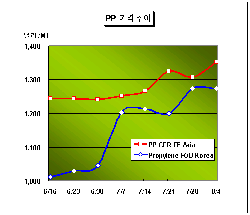 Block Copolymer는 1400달러 노려 … SK 34만톤 9월 정기보수 PP 가격은 8월2일 Raffia/Injection 그레이드 기준 CFR FE Asia 톤당 1350-1355달러로 45달러 급등했다.아시아 PP(Polypropylene) 시장은 업스트림인 프로필렌(Propylene) 가격강세와 중국수요 호조로 18년만에 최고가를 갱신했다. 프로필렌 가격은 7월28일 FOB Korea 톤당 1275달러로 75달러 급등한 이후 8월4일 보합세를 기록했으며 에틸렌(Ethylene) 크래커의 여름철 정기보수가 임박함에 따라 가격급등이 우려되고 있다. 타이완 CPC(Chinese Petroleum)의 Kaohsiung 소재 No.5 에틸렌 50만톤/프로필렌 22만8000톤 크래커는 8월4일 40-45일간의 정기보수에 돌입했으며 SK의 울산 소재 No.2 에틸렌 62만톤/프로필렌 32만5000톤 크래커는 8월말 4주간의 정기보수를 예정하고 있다. SK의 울산 소재 PP 34만톤 플랜트는 No.2 크래커의 정기보수 기간에 맞춰 9월초 3주간의 정기보수에 들어갈 것으로 파악되고 있다. Block Copolymer 그레이드는 CFR FE Asia 톤당 1380-1385달러로 43달러 급등했으며 중국 내수가격은 Raffia/Injection 기준 ex-Works 톤당 1만2900-1만3000위안을 형성했다.