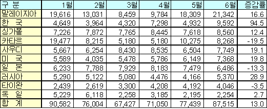 6월 9592톤으로 94.5% 급증 … 말레이지아는 2만톤으로 1위 고수 국내산 LDPE(Low-Density Polyethylene)가 중국 수입시장 2위로 도약했다.중국의 국내산 수입량은 6월 9592톤으로 94.5% 급증했으며 1위는 16.6%의 증가율을 보인 말레이시아가 고수한 것으로 나타났다. 카타르산 수입은 19.5% 감소해 5월 2위에서 6월 4위로 밀려났으며 싱가폴이 8560톤으로 12.4% 증가해 3위 자리를 지켰다. 일본과 타이완은 각각 13.3%, 3.5%의 감소율을 기록했으며 러시아가 28.9%의 수입증가율을 보여 미국 19.8%를 능가한 것으로 파악되고 있다.
