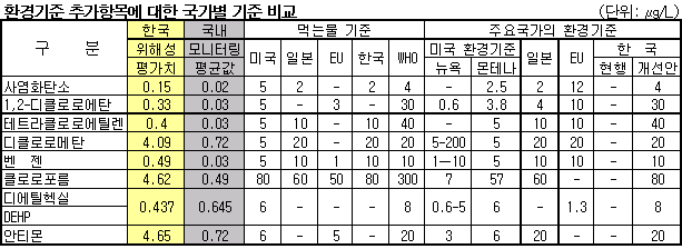 환경부, 건강보호항목 2009년 17개로 … DEHPㆍ안티몬은 2009년부터 발암물질로 알려진 벤젠이 2007년 1월부터 물환경 기준 항목으로 포함된다.환경부는 사람의 건강보호를 강화하기 위해 현행 물환경 기준의 건강보호항목을 당초 9개 항목에서 17개 항목으로 대폭 확대하는 환경정책기본법시행령 개정을 추진한다고 발표했다. 이에 따라 생태계 건전성을 확보하기 위한 물 등급별 생물지표종을 도입해 물환경에 대한 생물학적 평가도 가능해질 전망이다.