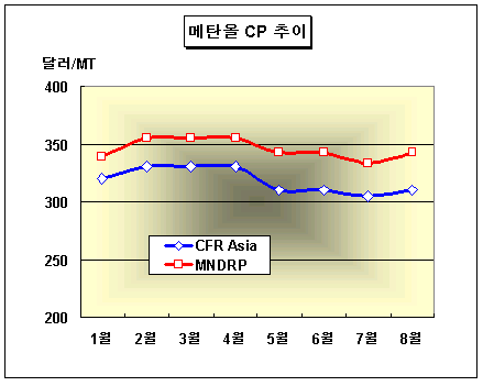 MNDRP와 함께 5-10달러 상승 … Methanex 플랜트 가동재개 아시아 메탄올(Methanol) 8월 계약가격(CP)이 CFR Asia 톤당 310달러로 5달러 인상됐다.Methanex의 아시아 메탄올 계약가격은 2006년 5-6월 310달러에서 7월 305달러로 주춤했지만 다시 310달러를 회복한 것으로 나타났다. 북미 MNDRP(Methanex Non Discounted Reference Price)도 8월 FOB US Gulf 톤당 343.00달러로 10.00달러 상승했는데 5-6월 343.00달러에서 7월 333.00달러로 하락한 바 있다. 아시아 Spot 가격도 다소 상승했는데 7월28일 CFR Korea 톤당 293달러로 5달러 상승한 이후 8월4일 보합세를 유지했다.