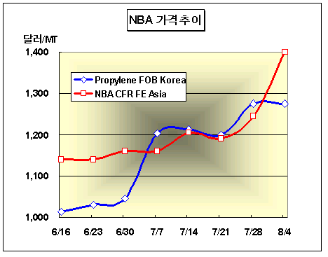 CFR FE Asia 1395-1405달러 형성 … 한ㆍ일 가동률 감축 돌입 NBA(Normal Butyl Alcohol) 가격은 8월3일 CFR FE Asia 톤당 1395-1405달러로 155달러 폭등했다.아시아 NBA 시장은 업스트림인 프로필렌(Propylene) 강세와 중국의 수요 호조 및 수급타이트가 맞물리면서 폭등세를 형성했다. 프로필렌 가격은 8월4일 FOB Korea 톤당 1270-1280달러로 보합세를 형성했으며 일본 Kyowa Hakko의 옥소알콜(Oxo-Alcohol) 설비는 사소한 트러블이 발생해 가동률 90%대를 유지하고 있는 것으로 알려졌다. 국내 LG화학은 8-9월 집중된 주요 크래커의 정기보수 여파로 8월 옥소알콜 설비의 가동률을 85%대로 유지할 예정으로 여수 2-EH(2-Ethylhexanol) 15만톤, 울산 DOP(Dioctyl Phthalate) 9만톤, 나주 2-EH 8만톤, DOP 15만톤, NBA 8만톤 플랜트에 적용될 것으로 파악되고 있다.